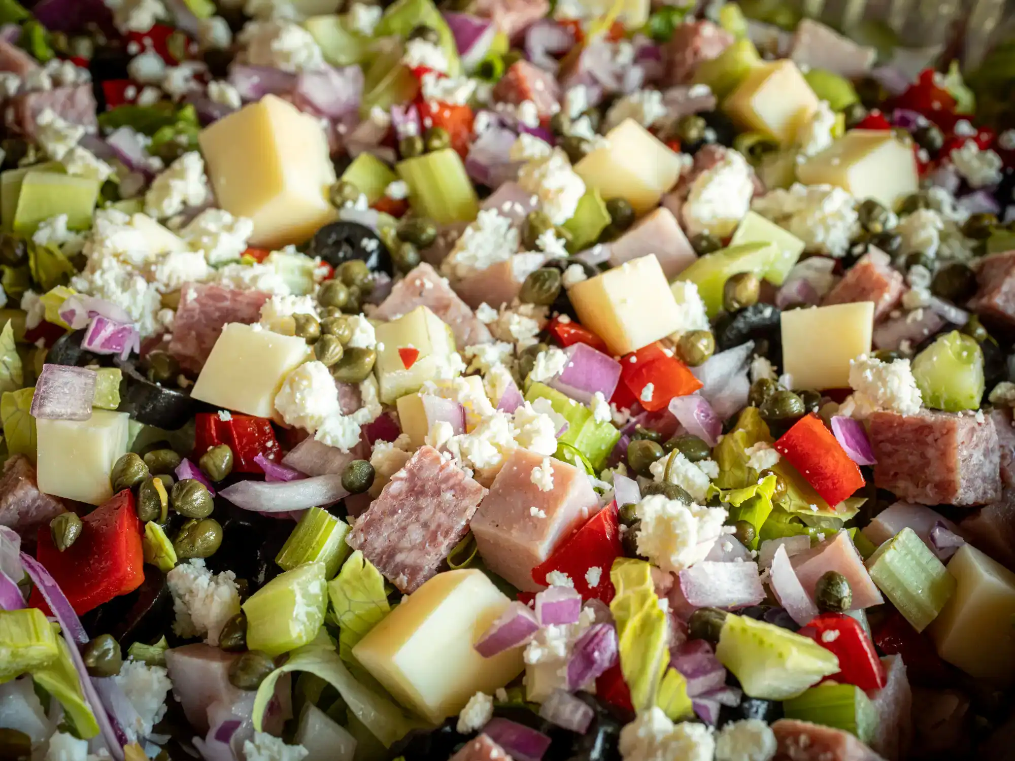 Diced salami, ham, chicken, provolone, feta, celery, black olives, capers, tomato, red onion with Dijon vinaigrette.